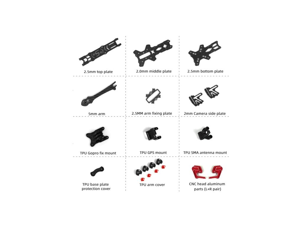 Součást balení: Rám včetně šroubků, 3D tisk držáků, pásek pro baterii, hliníkové CNC části