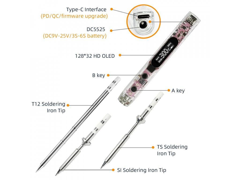 Nic víc k pájení již nepotřebujete, jen zdroj, který může mít několik podob. Pájecí pero je možné napájet přes kabel s koncovkou XT60 (součást balení) nebo i přes konektor USB-C. Ovládání je naprosto intuitivní, po zapnutí si zvolíte pracovní teplotu v rozmezí 50-450°C, dlouhým podržením tlačítka pájku aktivujete a po 10s sekundách můžete pájet.